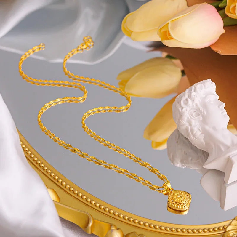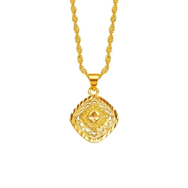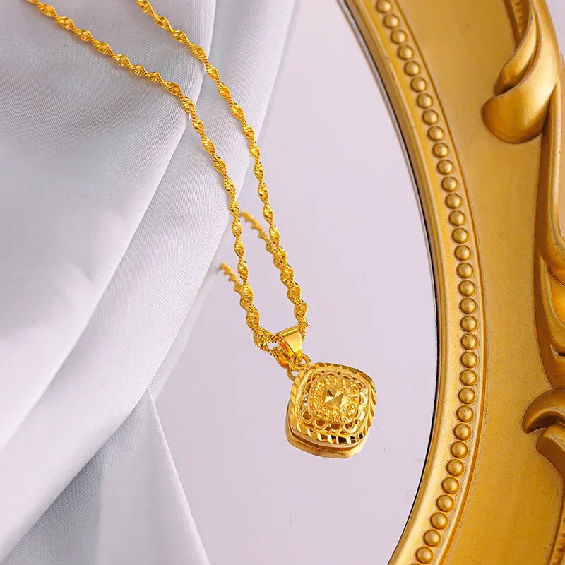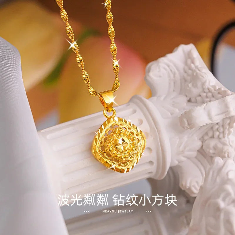 18K Gold Necklace Temperament Womens AU750 Versatile Diamond Pattern Small Square Pendant Clavicle Necklace