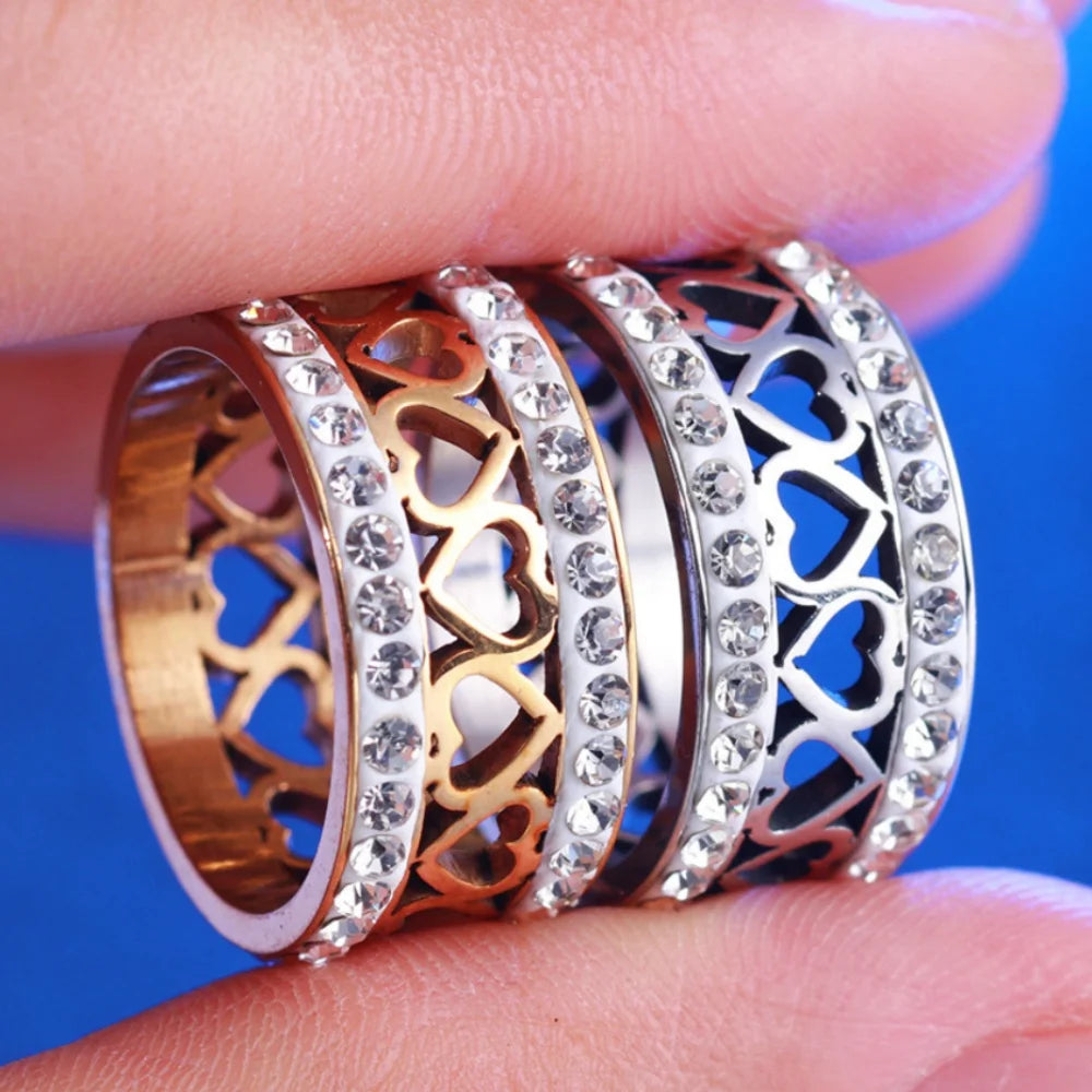 Big Size Hollow Out Woman's Iced Out Cubic Zircon Bling Heart Ring Stainless Steel Gold Silver Color CZ Wedding Rings For Women