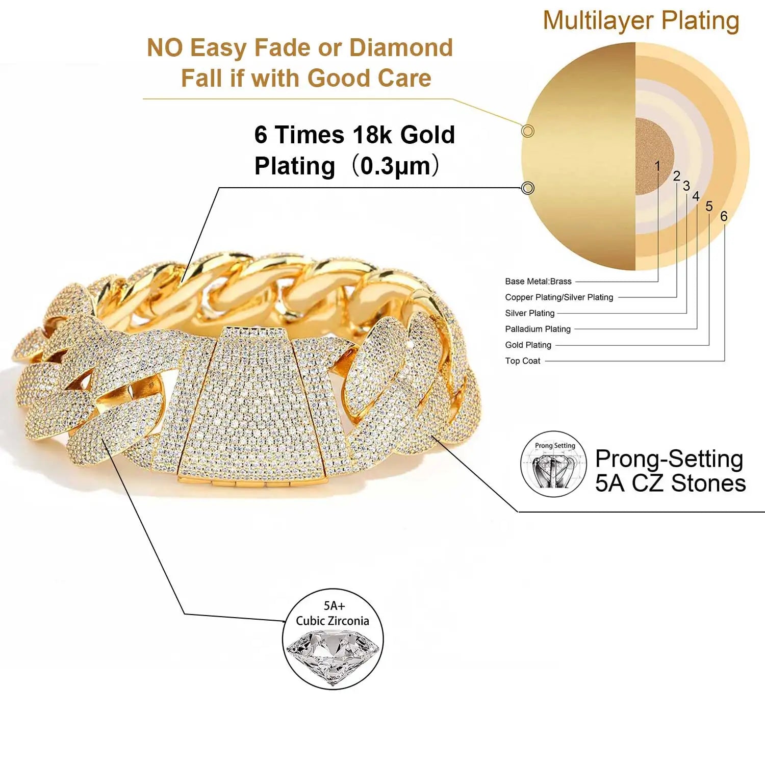 Hip Hop 22MM 6 Row Heavy Cuban Prong Chain Bling Iced Out Box Buckle Copper Setting 5A Cubic Zirconia Bracelet For Mens Jewelry