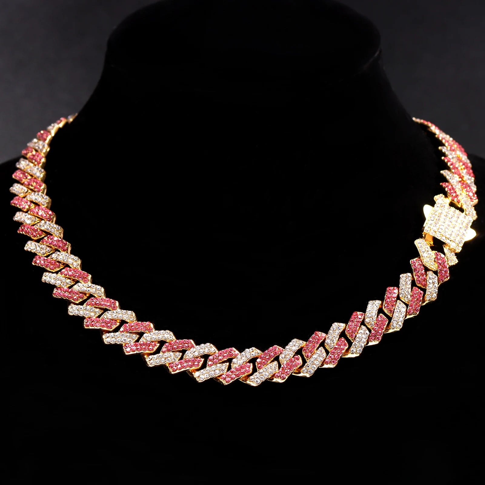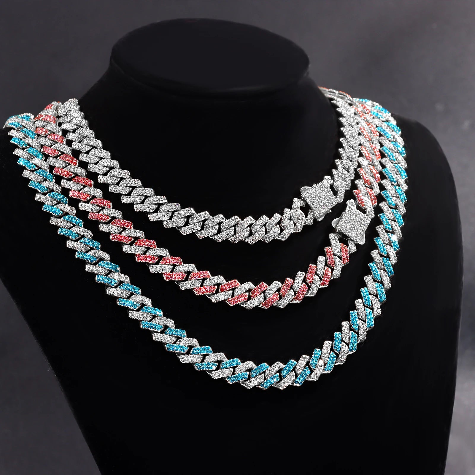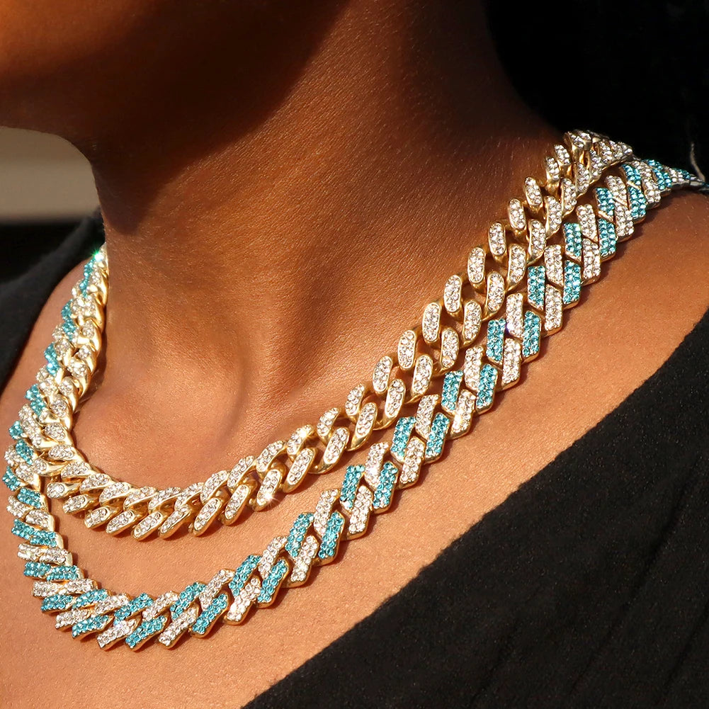Iced Out Cuban Link Chain Necklace 14MM 2 Row Rhinestone Paved Prong