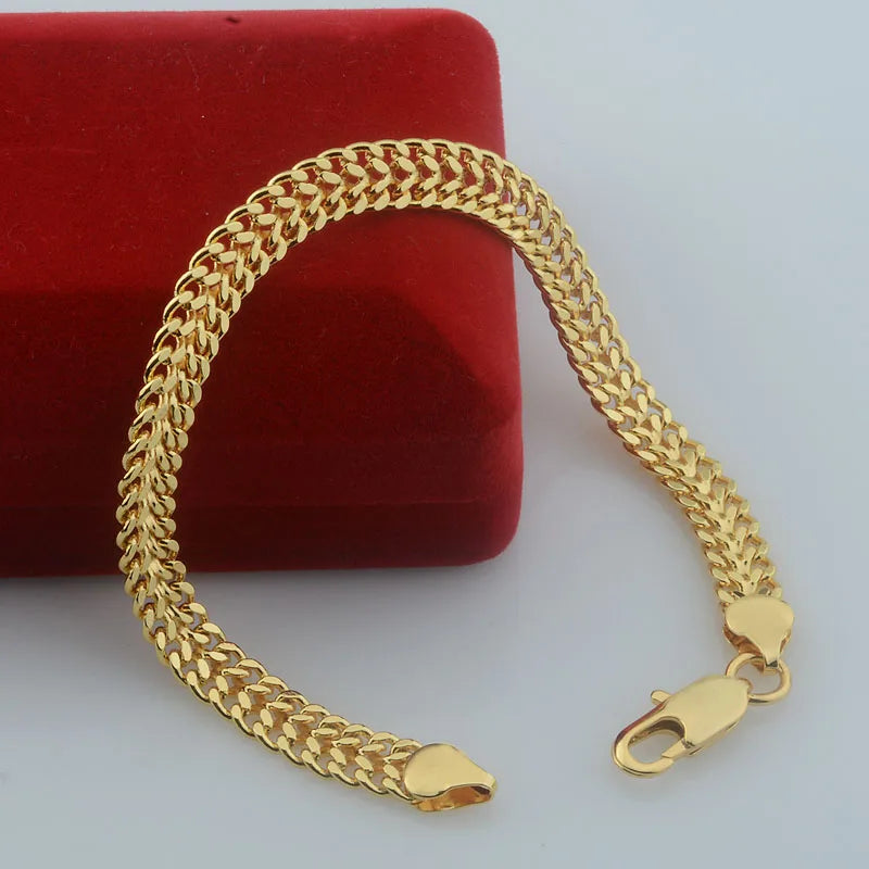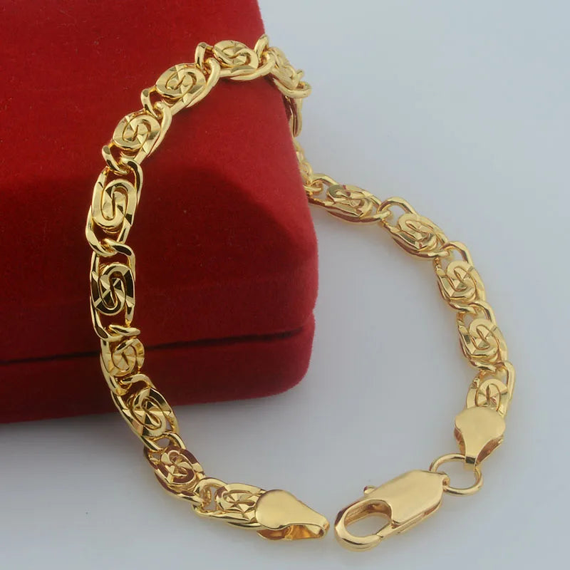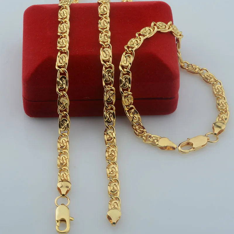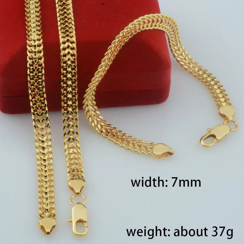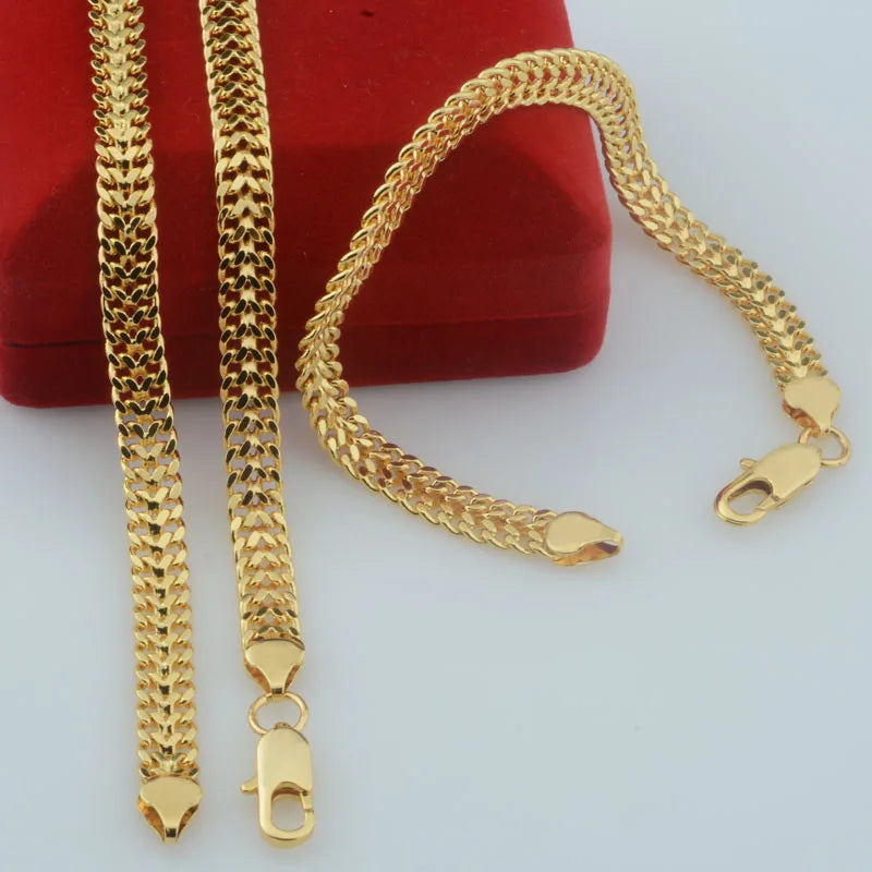 Yellow Gold Color Curb Carving Necklace Link Bracelet Set Jewelry