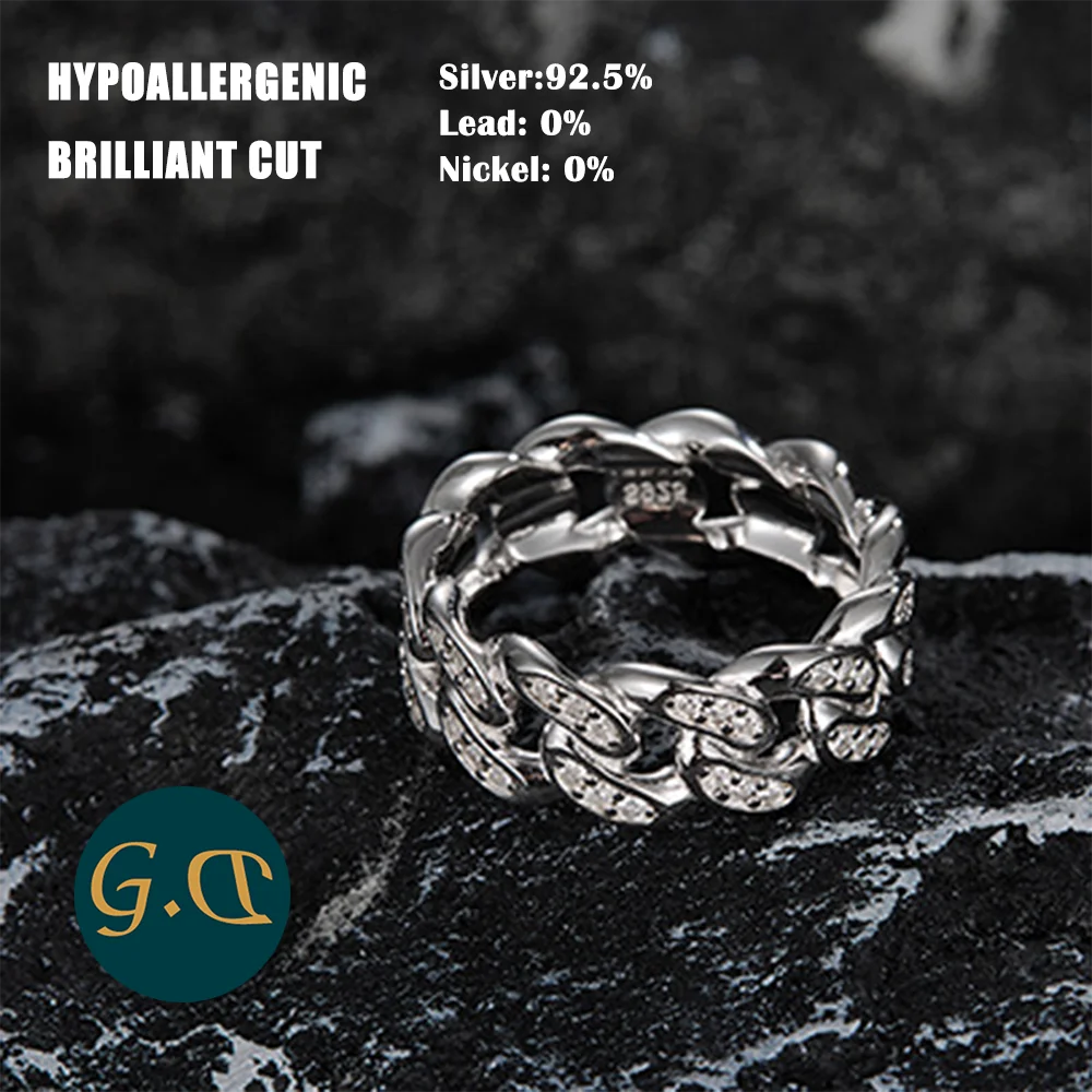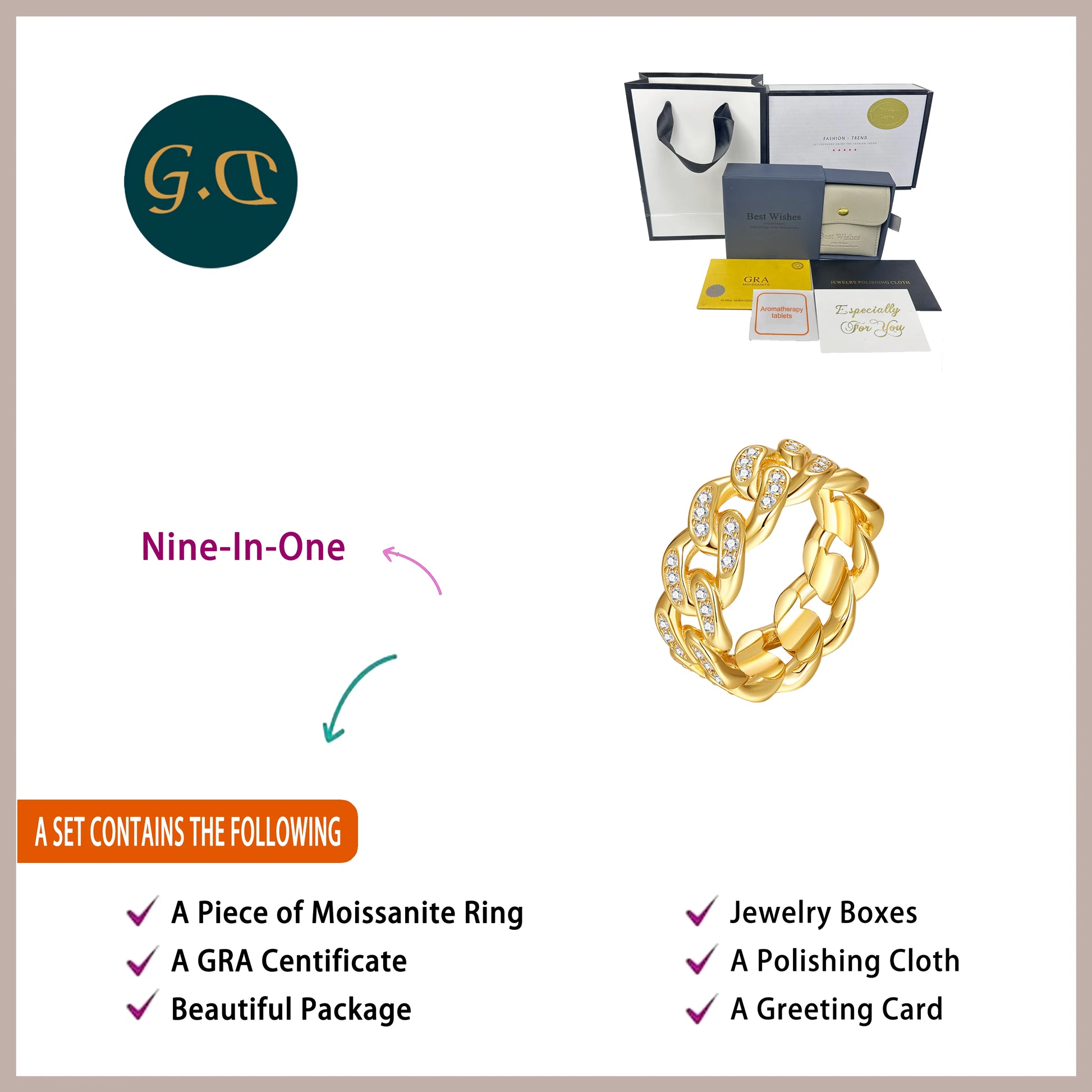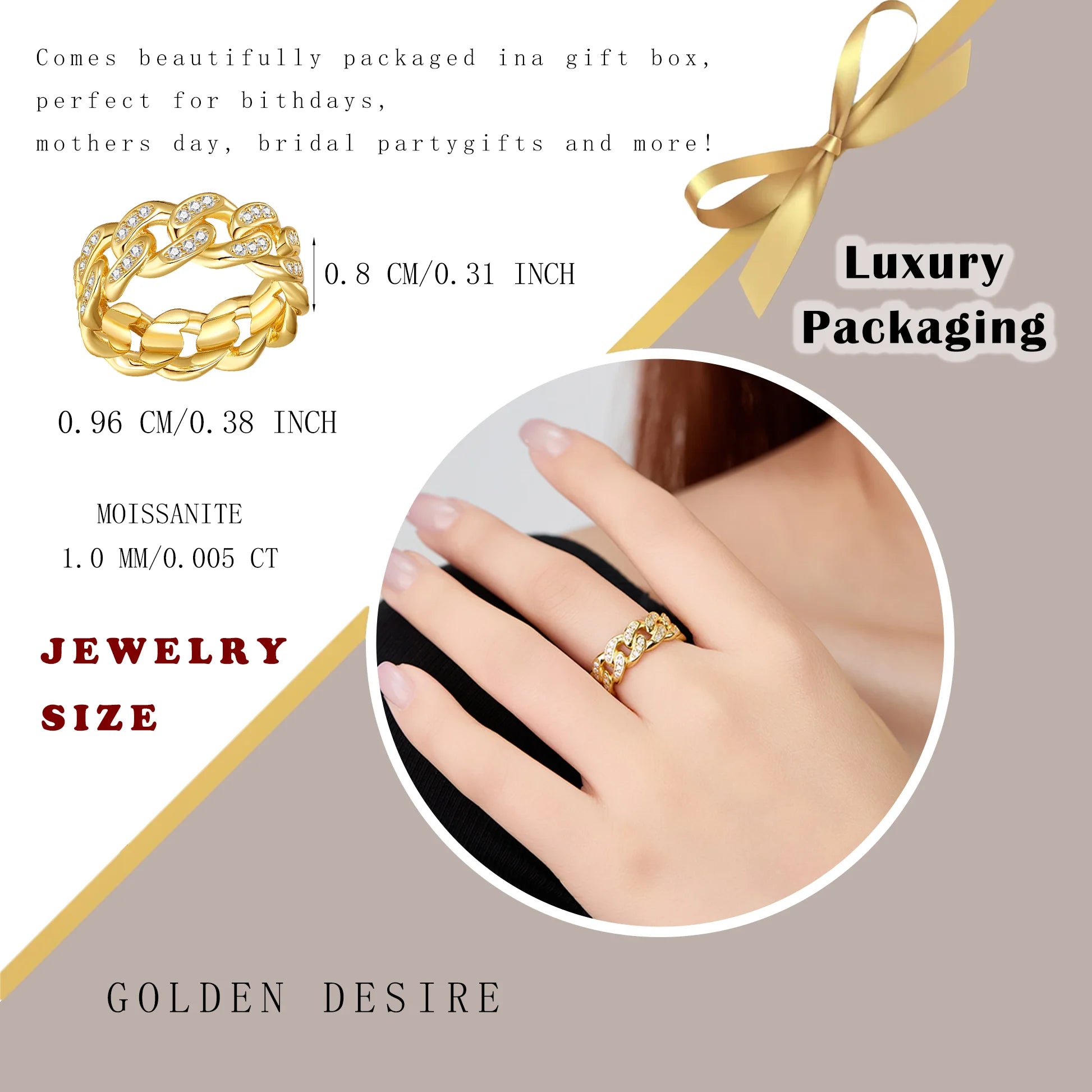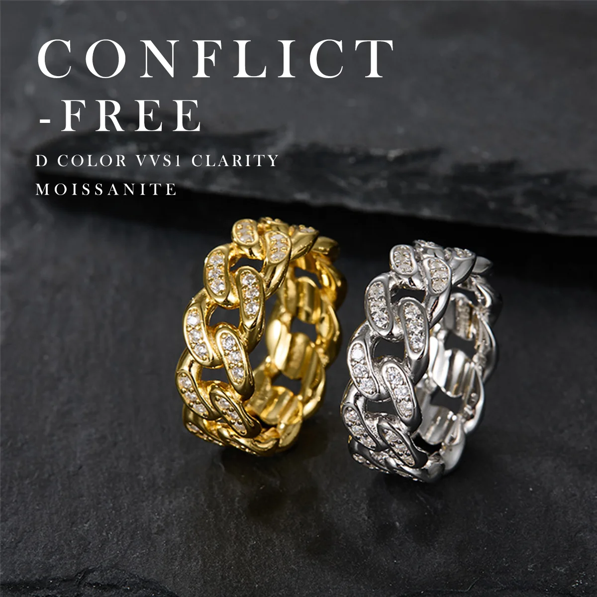 This ring combines the boldness of chain-link design with the spirit of hip-hop culture, creating a fashion-forward piece that speaks to self-expression and individuality. The luxurious finish of S925 sterling silver and 18K gold plating ensures it stands out, while the moissanite stones add an extra touch of brilliance. It is designed for those who want to make a statement in a stylish yet meaningful way, blending street culture with high-end elegance.